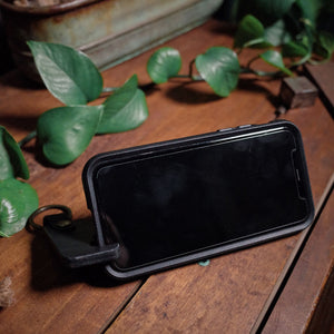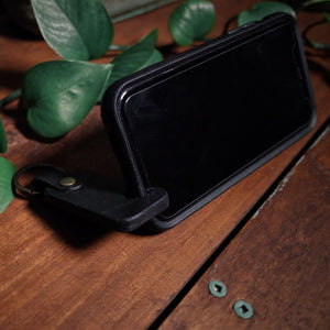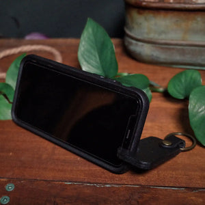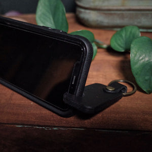 Discover the black leather keychain phone holder, crafted from durable vegetable-tanned leather. Portable, hands-free phone stand with antique-brass key ring.